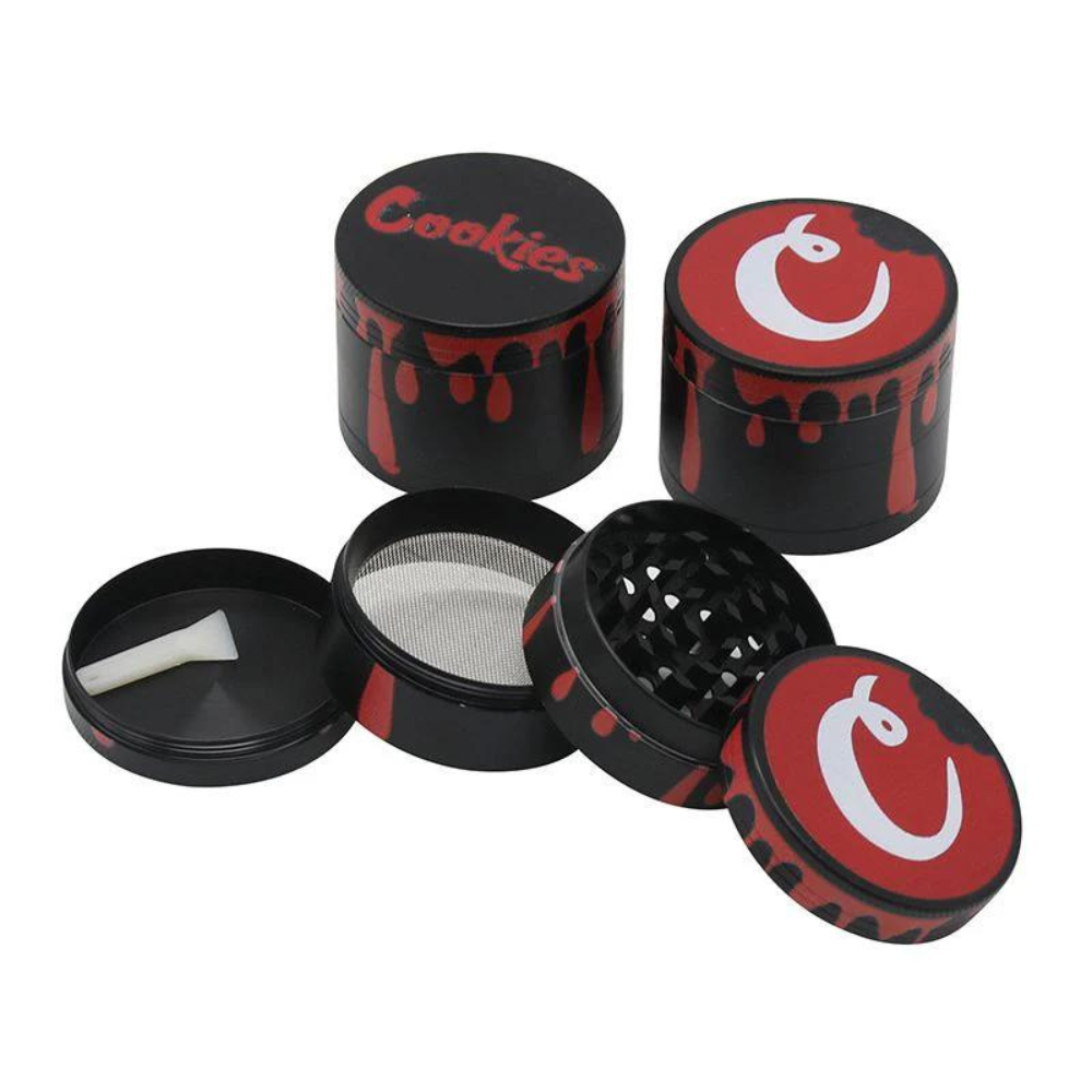 The 4-Piece Cookies 2-Inch Zinc Alloy Metal Grinder (Display of 6 G22) is a compact and durable tool designed for efficient herb grinding. Each grinder features a distinctive cookies design and is constructed from sturdy zinc alloy metal. The 4-piece design includes a top compartment for easy loading, a grinding chamber with sharp teeth for a smooth and consistent grind, a screen for sifting pollen, and a bottom chamber for collecting the ground material. With its 2-inch diameter, it offers a compact yet effective grinding solution. This display of 6 is perfect for adding a touch of style and functionality to any collection or retail setup.