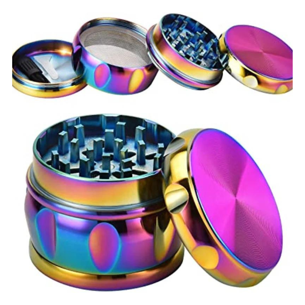 The 4-Piece Rainbow 2.5-Inch Grinder (Display of 6 G4) offers a vibrant and functional solution for herb grinding. Featuring a dazzling rainbow finish, each 4-piece grinder includes a top compartment for loading, a grinding chamber with sharp teeth for a smooth grind, a screen for pollen collection, and a bottom chamber for easy retrieval of ground material. With a 2.5-inch diameter, these grinders provide ample space while remaining compact. The display of 6 is perfect for showcasing this colorful and practical accessory, making it an attractive choice for both personal use and retail settings.