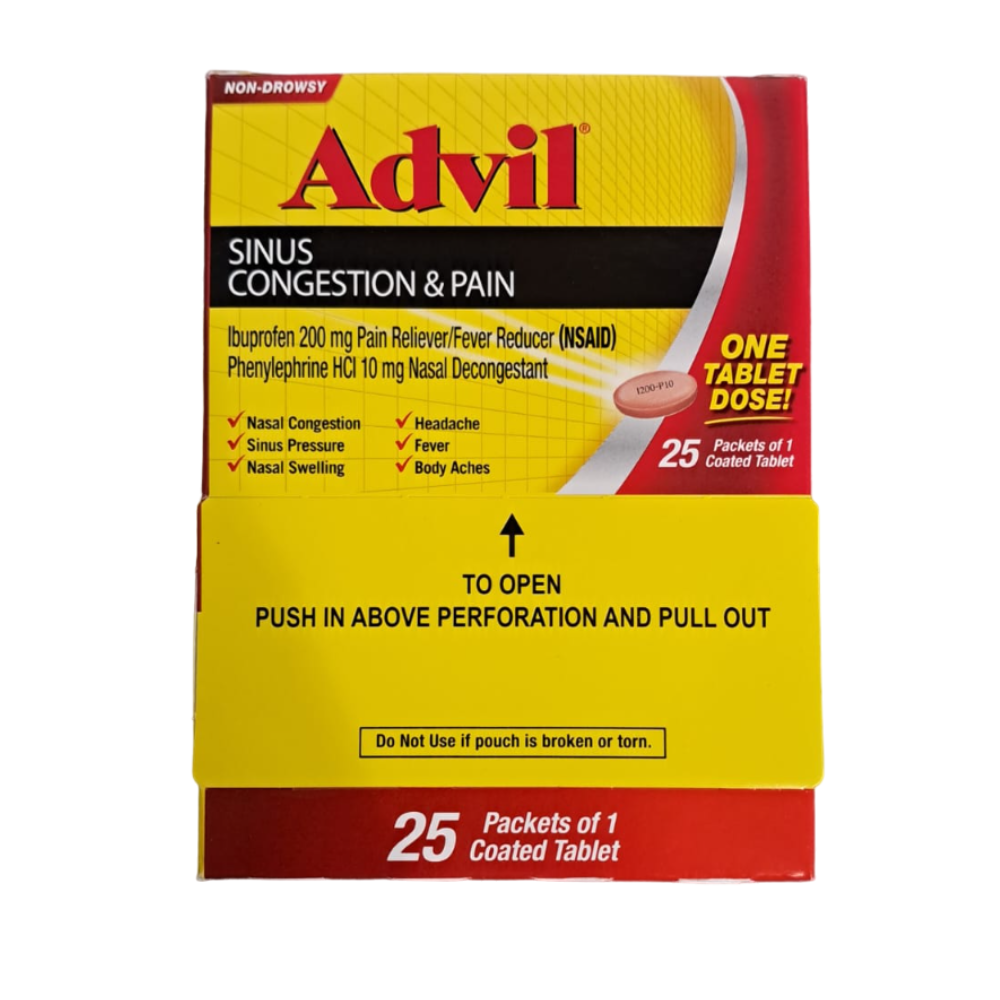 The pack of 25 tablets ensures you have a sufficient supply for managing sinus congestion, headaches, and associated discomfort over several days or as needed. Advil's formula is designed to relieve pain and reduce inflammation, offering quick and effective relief for sinus-related issues.