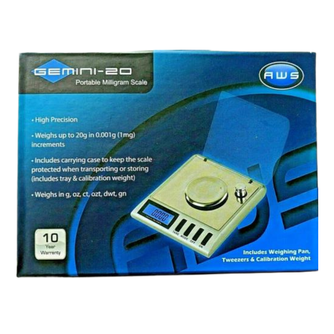 The AWS Gemini-20 Portable Milligram Scale is designed for high-precision weighing, offering a capacity of up to 20 grams with milligram-level accuracy (0.001 grams). Its compact and portable design makes it perfect for on-the-go use, ideal for weighing fine powders, jewelry, and small components. The scale features a clear digital display for easy reading and comes with a protective cover to safeguard the weighing platform. Reliable and accurate, the AWS Gemini-20 is a versatile tool for both personal and professional applications.