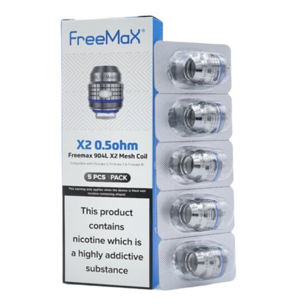 The Freemax 904L X2 0.5 Ohm Mesh Coil comes in a pack of five and is designed to provide a superior vaping experience with enhanced flavor and vapor production. Featuring a dual mesh build, this coil supports a wattage range of 20-50W, making it ideal for a smooth and satisfying sub-ohm vape. The mesh construction ensures even heating and consistent performance, making it a reliable choice for use with compatible Freemax tanks.