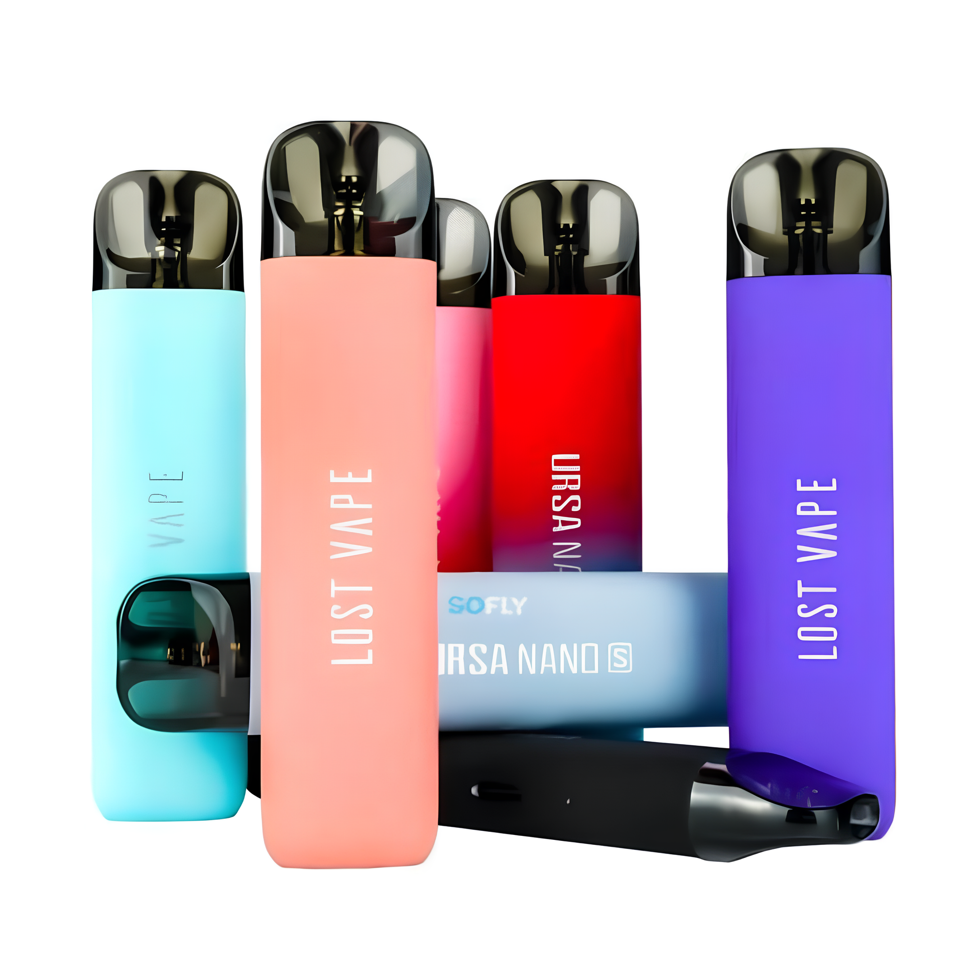 The Lost Vape Ursa Nano S Pod Kit is a compact and convenient all-in-one refillable device. It includes an internal 800 mAh rechargeable battery and a 2.5 mL pod designed for use with salt nicotine e-liquids. The pod connects magnetically for easy swaps and refills through a side silicone-sealed port. Charging is handled via a USB Type-C cable, and the device features an LED indicator light. It also allows for airflow adjustment with a dial and operates with draw-activated firing.