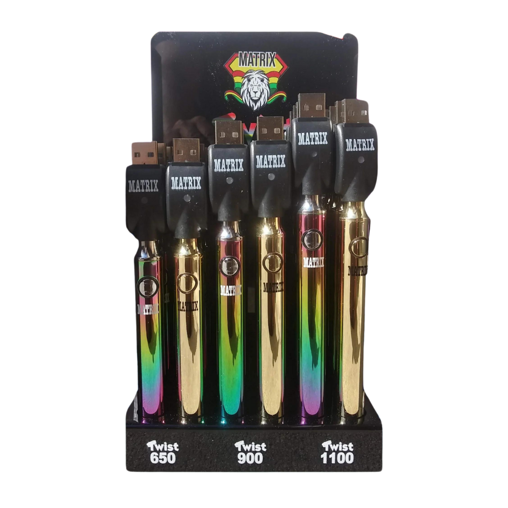 Meet all your vaping needs with the Matrix Battery Display, featuring a variety of battery capacities—650mAh, 900mAh, and 1100mAh. This comprehensive display pack offers a range of options to suit different vaping preferences, all in one convenient set.