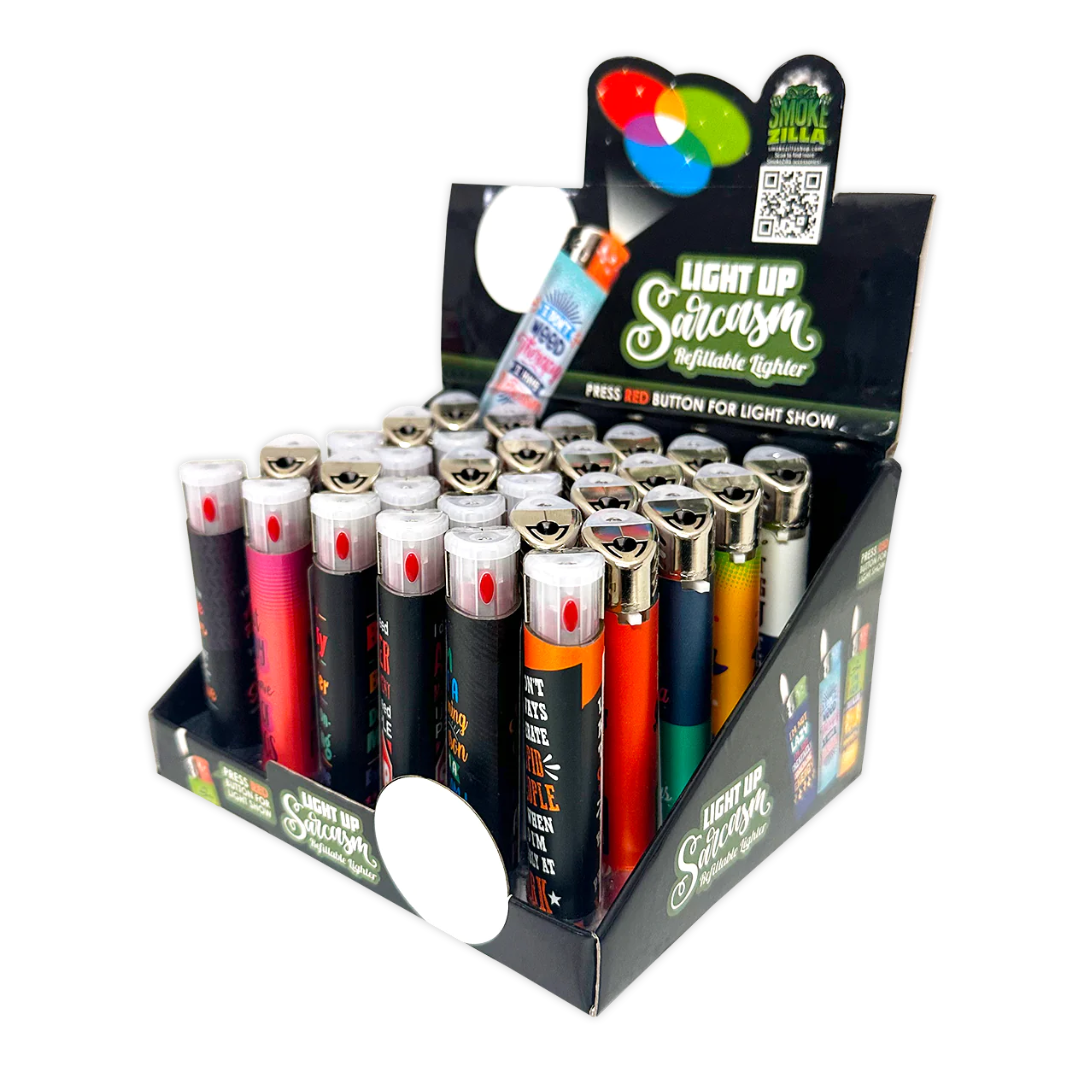 The Smoke Zilla Light Up Sarcasm Refillable Lighter pack of 30 combines functionality with a touch of humor. Each lighter features a distinctive sarcastic design that adds a playful element to your everyday lighting needs. Designed to be refillable, these lighters offer long-lasting use and reliability. The built-in light-up feature enhances visibility in low-light conditions, making them practical for a variety of settings. Available in assorted designs and colors, the pack of 30 is perfect for personal use, gifts, or promotional purposes, providing both a practical lighting solution and a fun conversation starter.