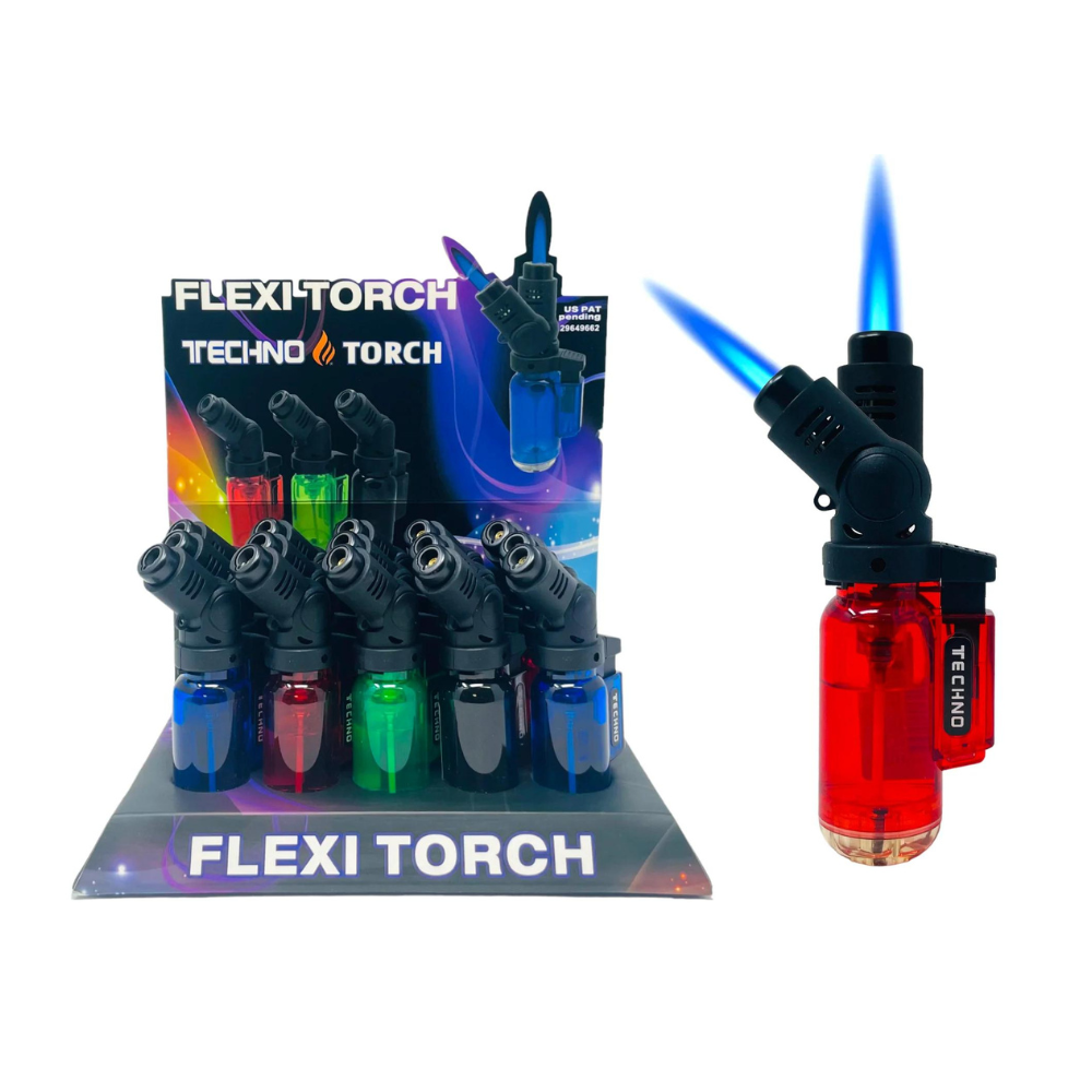 The Techno Torch Transparent Flexi Single Flame Lighter is available in a pack of 15. This lighter features a transparent design that allows you to easily monitor the butane level. Its flexible neck provides adjustable reach and precise control over the flame. With a single, powerful flame, it's ideal for a range of uses from lighting cigars to culinary applications. The lighter is refillable, ensuring long-term reliability. Combining functionality with a sleek, modern look, the Techno Torch Transparent Flexi Single Flame Lighter is perfect for personal use or retail settings.