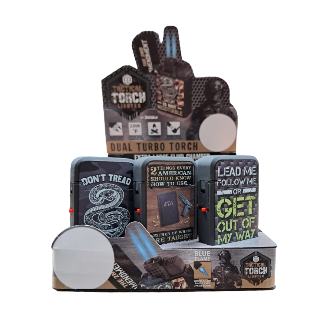 The Torch Blue Tactical Dual Turbo Torch E-Lighter pack of 15 offers a high-performance lighting solution with a sleek and durable design. Each lighter features a dual turbo torch flame, providing intense and wind-resistant ignition for a variety of uses, from lighting cigars and candles to outdoor adventures. The integrated E-lighter functionality ensures easy and reliable ignition, while the tactical design enhances grip and control. Available in assorted colors, these lighters combine functionality with a touch of style. The pack of 15 is ideal for personal use, gifts, or distribution, ensuring you have a reliable and versatile lighting tool at your disposal.