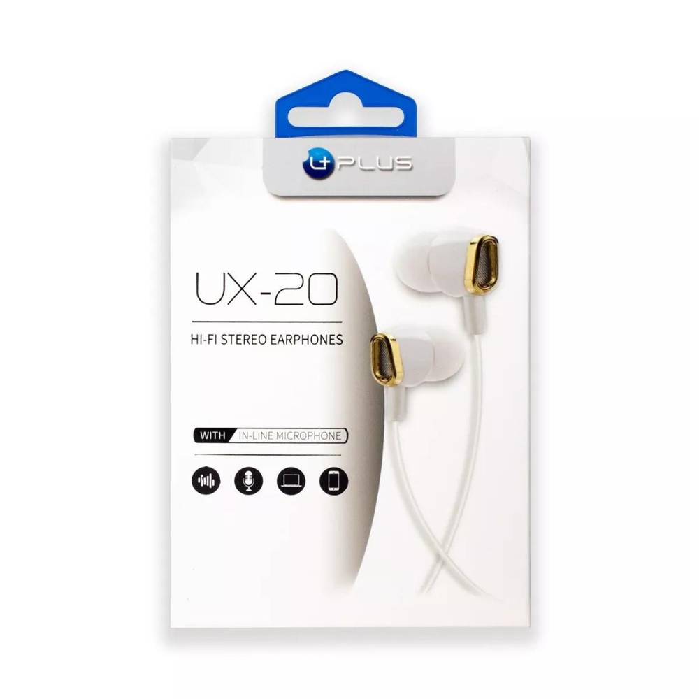 The UPLUS UX-20 Earphones offer a blend of style and functionality, featuring a sleek white and gold design. These earphones are equipped with an in-line microphone, providing convenient hands-free communication and control.